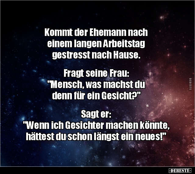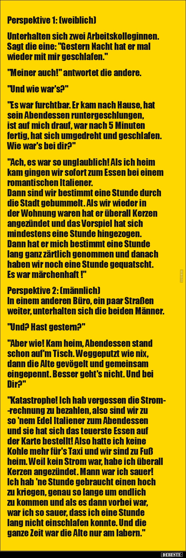 "Es war furchtbar. Er kam nach Hause, hat sein Abendessen runtergeschlungen, ist auf mich drauf, war nach 5 Minuten fertig, hat sich umgedreht und geschlafen. Wie war's bei dir?"