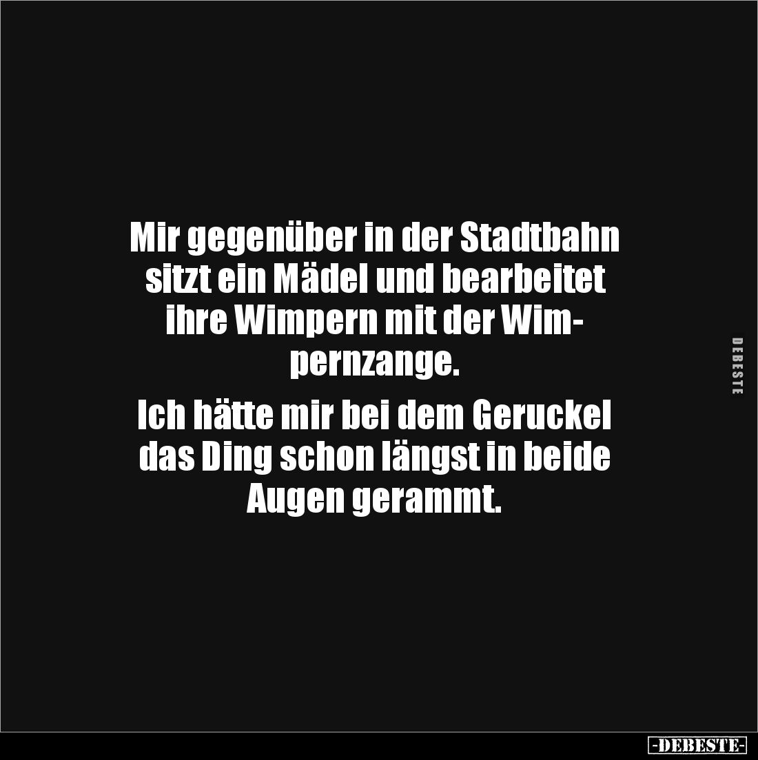Mir gegenüber in der Stadtbahn sitzt ein Mädel und bearbeitet ihre Wimpern mit der Wim- pernzange. Ich hätte mir bei dem Geruckel das Ding schon längst in beide Augen gerammt.