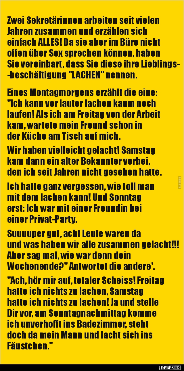 Zwei Sekretärinnen arbeiten seit vielen Jahren zusammen und erzählen sich einfach ALLES! Da sie aber im Büro nicht offen über Sex sprechen können, haben Sie vereinbart, dass Sie diese ihre Lieblings-