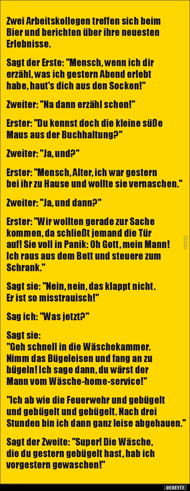 Sagt der Erste: "Mensch, wenn ich dir erzähl, was ich gestern Abend erlebt habe, haut's dich aus den Socken!"