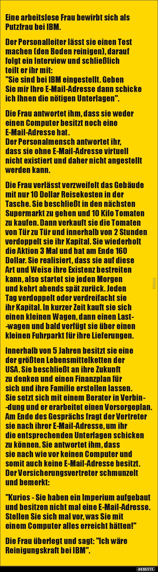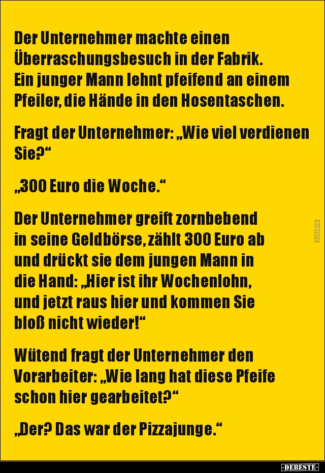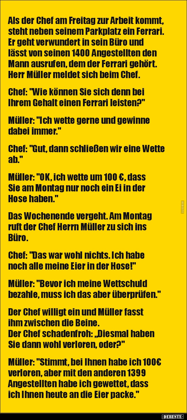 Als der Chef am Freitag zur Arbeit kommt, steht neben seinem Parkplatz ein Ferrari. Er geht verwundert in sein Büro und lässt von seinen 1400 Angestellten den Mann ausrufen, dem der Ferrari gehört. Herr Müller meldet sich beim Chef.