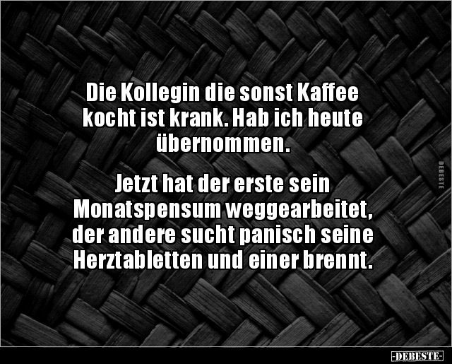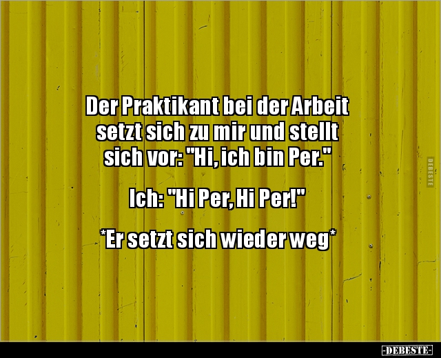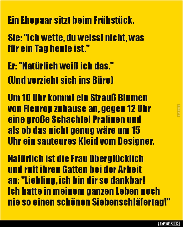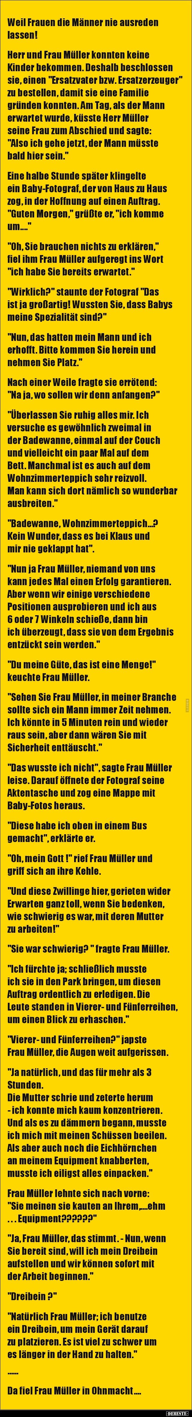 Herr und Frau Müller konnten keine Kinder bekommen. Deshalb beschlossen sie, einen "Ersatzvater bzw. Ersatzerzeuger" zu bestellen, damit sie eine Familie gründen konnten. Am Tag, als der Mann erwartet wurde, küsste Herr Müller seine Frau zum Abschied und sagte: "Also ich gehe jetzt, der Mann müsste bald hier sein."