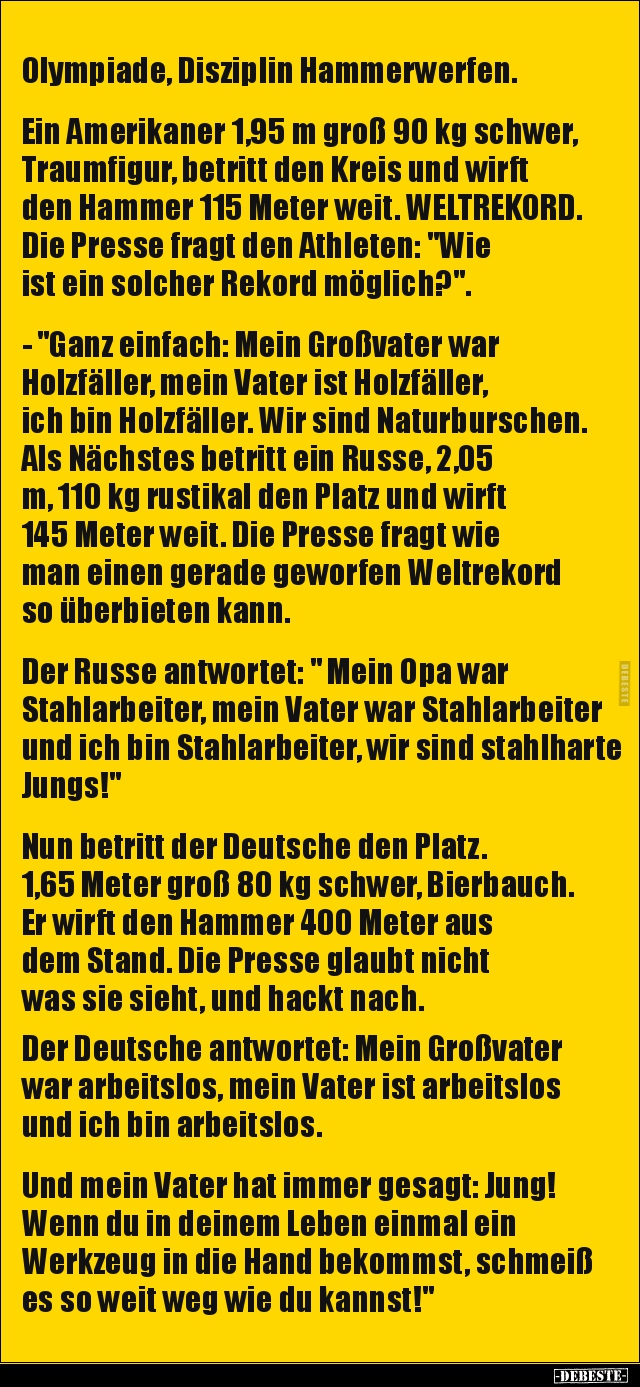 Ein Amerikaner 1,95 m groß 90 kg schwer, Traumfigur, betritt den Kreis und wirft den Hammer 115 Meter weit. WELTREKORD. Die Presse fragt den Athleten: "Wie ist ein solcher Rekord möglich?".