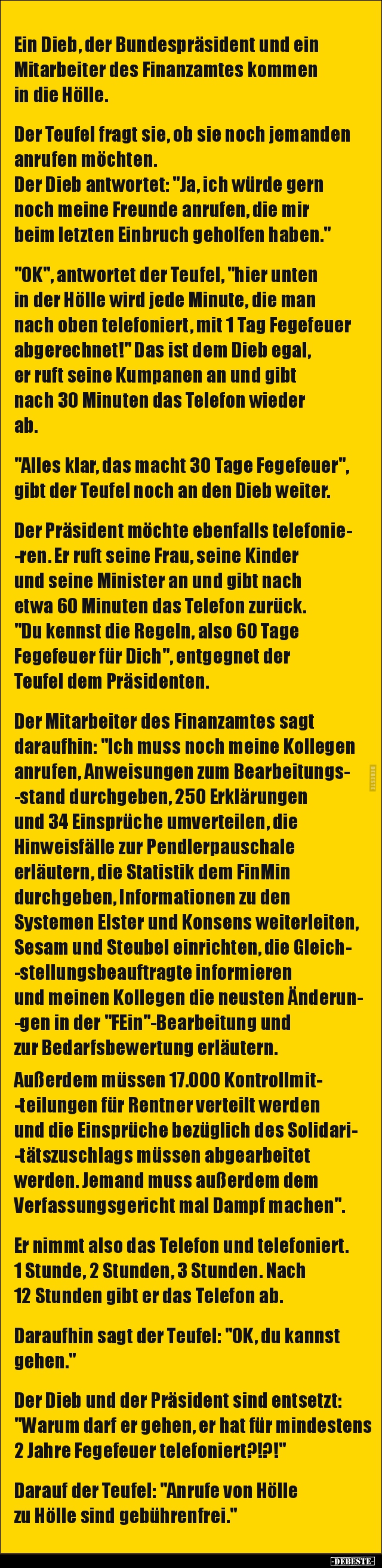 Ein Dieb, der Bundespräsident und ein Mitarbeiter des Finanzamtes kommen in die Hölle.