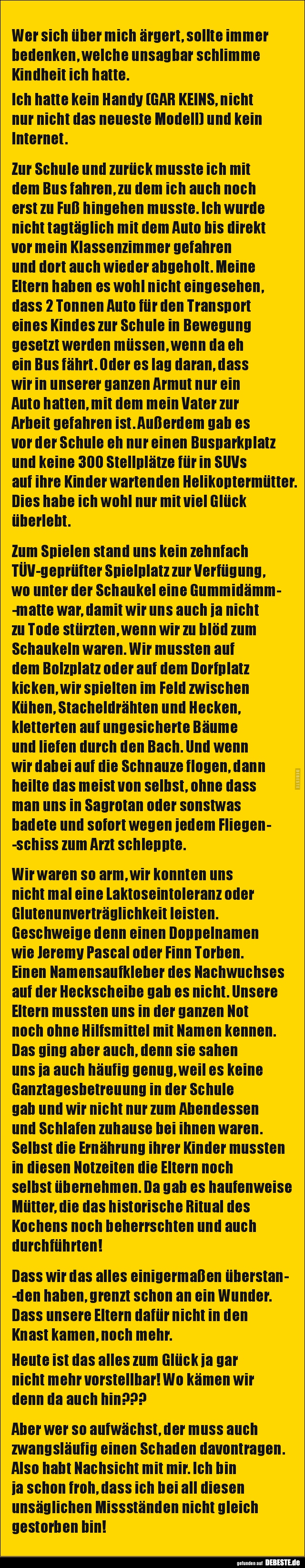 Zur Schule und zurück musste ich mit dem Bus fahren, zu dem ich auch noch erst zu Fuß hingehen musste. Ich wurde nicht tagtäglich mit dem Auto bis direkt vor mein Klassenzimmer gefahren und dort auch wieder abgeholt. Meine Eltern haben es wohl nicht eingesehen, dass 2 Tonnen Auto für den Transport eines Kindes zur Schule in Bewegung gesetzt werden müssen, wenn da eh ein Bus fährt. Oder es lag daran, dass wir in unserer ganzen Armut nur ein Auto hatten, mit dem mein Vater zur Arbeit gefahren ist. Außerdem gab es vor der Schule eh nur einen Busparkplatz und keine 300 Stellplätze für in SUVs auf ihre Kinder wartenden Helikoptermütter. Dies habe ich wohl nur mit viel Glück überlebt.