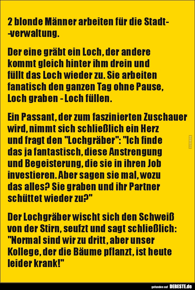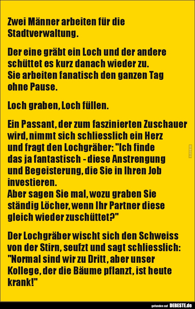 Der eine gräbt ein Loch, der andere kommt gleich hinter ihm drein und füllt das Loch wieder zu. Sie arbeiten fanatisch den ganzen Tag ohne Pause, Loch graben - Loch füllen.