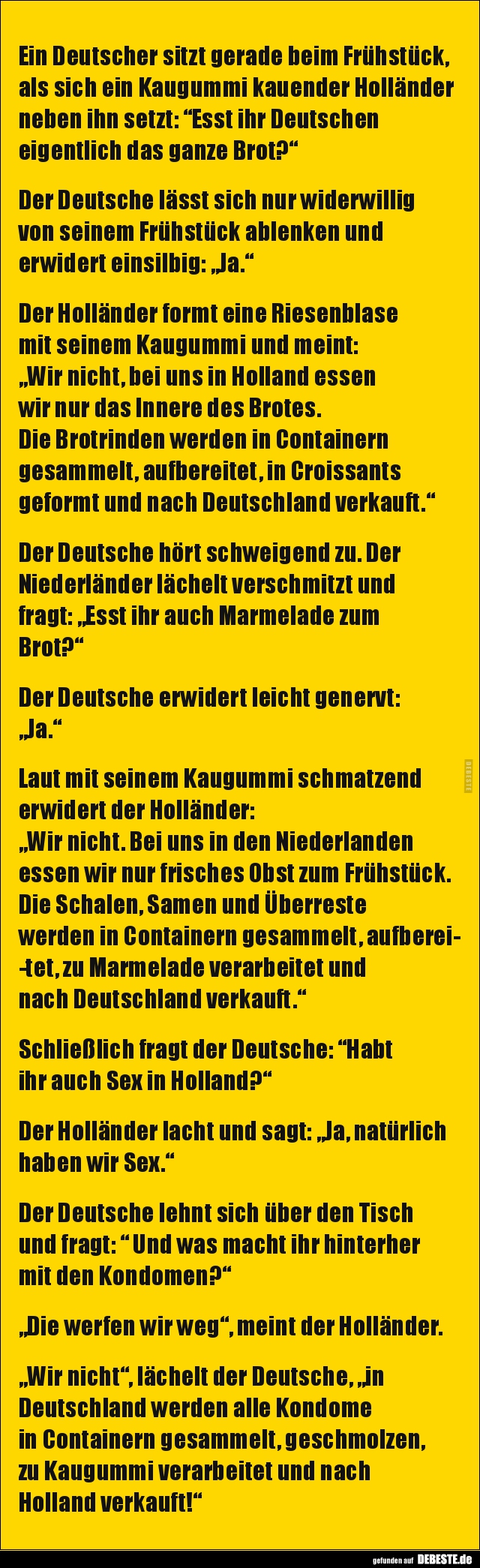 Ein Deutscher sitzt gerade beim Frühstück, als sich ein Kaugummi kauender Holländer neben ihn setzt: “Esst ihr Deutschen eigentlich das ganze Brot?“