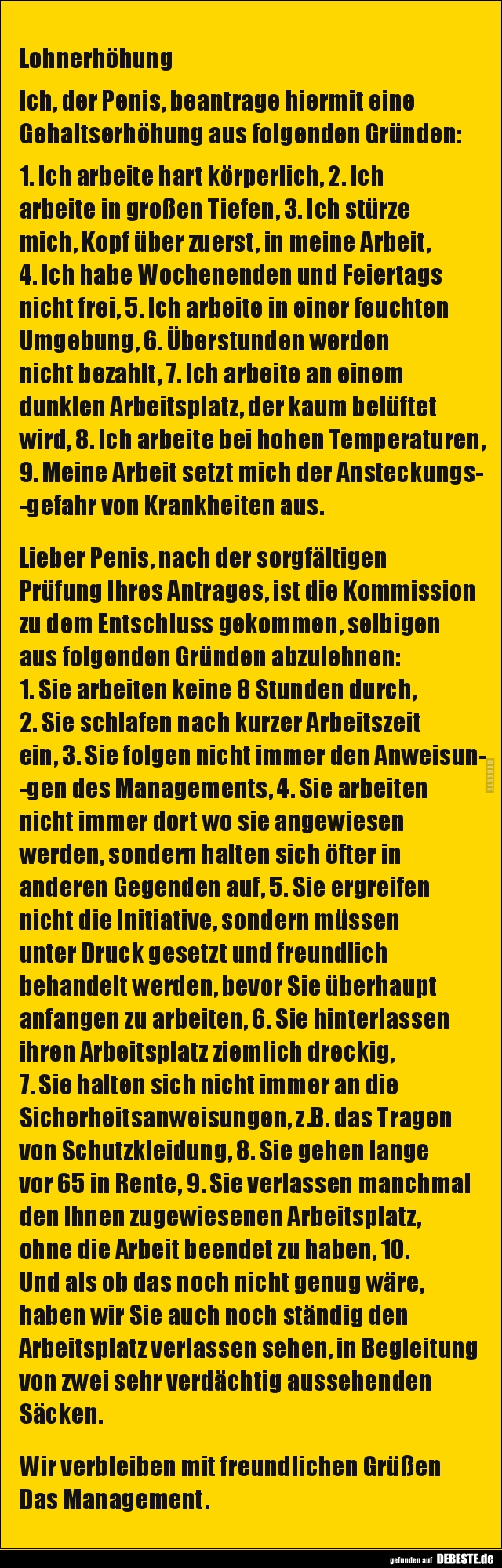 Ich, der Penis, beantrage hiermit eine Gehaltserhöhung aus folgenden Gründen: