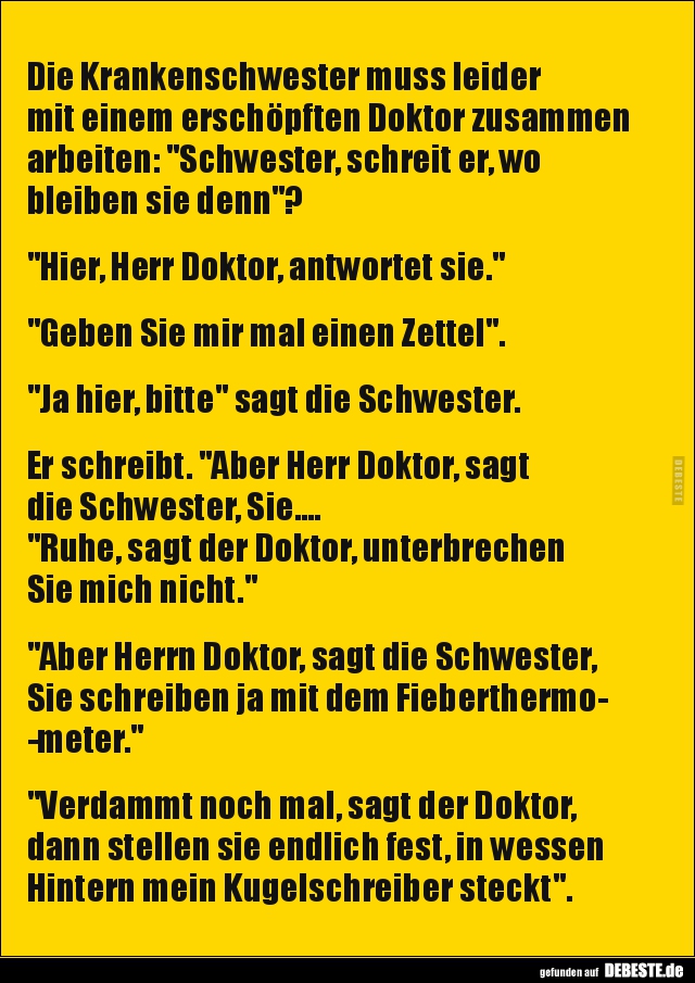 Die Krankenschwester muss leider mit einem erschöpften Doktor zusammen arbeiten: "Schwester, schreit er, wo bleiben sie denn"?
