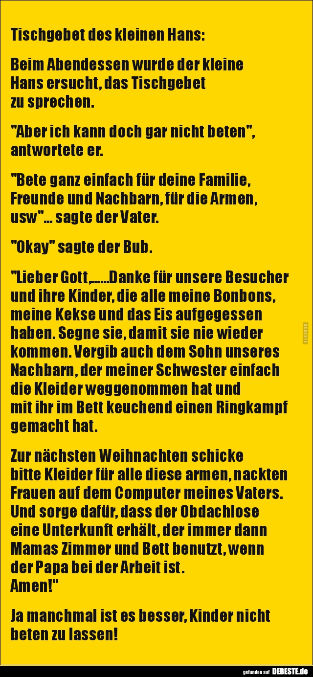"Lieber Gott…… Danke für unsere Besucher und ihre Kinder, die alle meine Bonbons, meine Kekse und das Eis aufgegessen haben. Segne sie, damit sie nie wieder kommen. Vergib auch dem Sohn unseres Nachbarn, der meiner Schwester einfach die Kleider weggenommen hat und mit ihr im Bett keuchend einen Ringkampf gemacht hat.