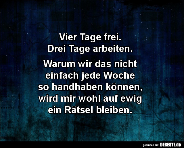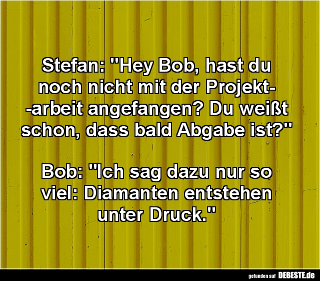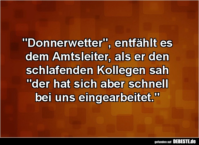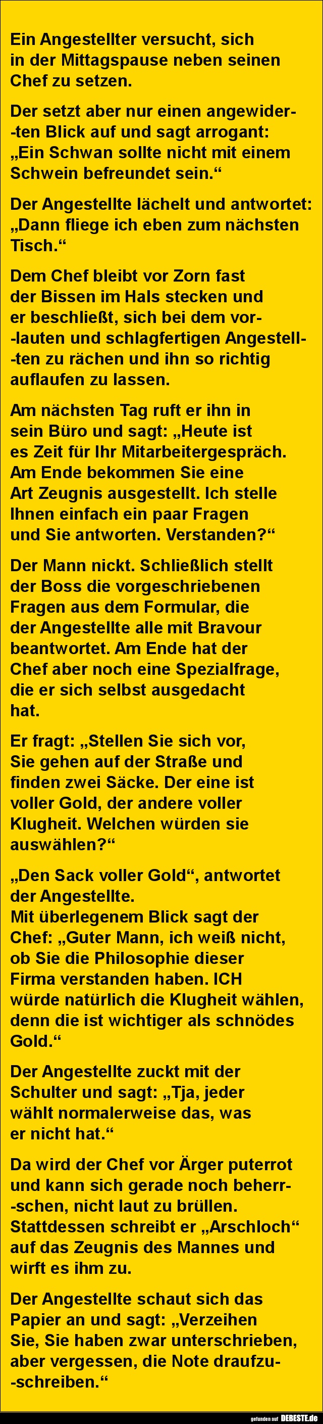 Am nächsten Tag ruft er ihn in sein Büro und sagt: „Heute ist es Zeit für Ihr Mitarbeitergespräch. Am Ende bekommen Sie eine Art Zeugnis ausgestellt. Ich stelle Ihnen einfach ein paar Fragen und Sie antworten. Verstanden?“