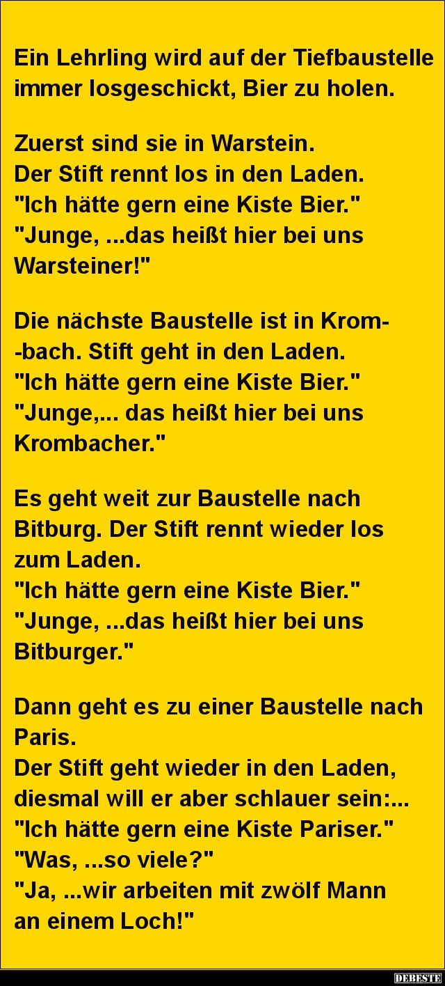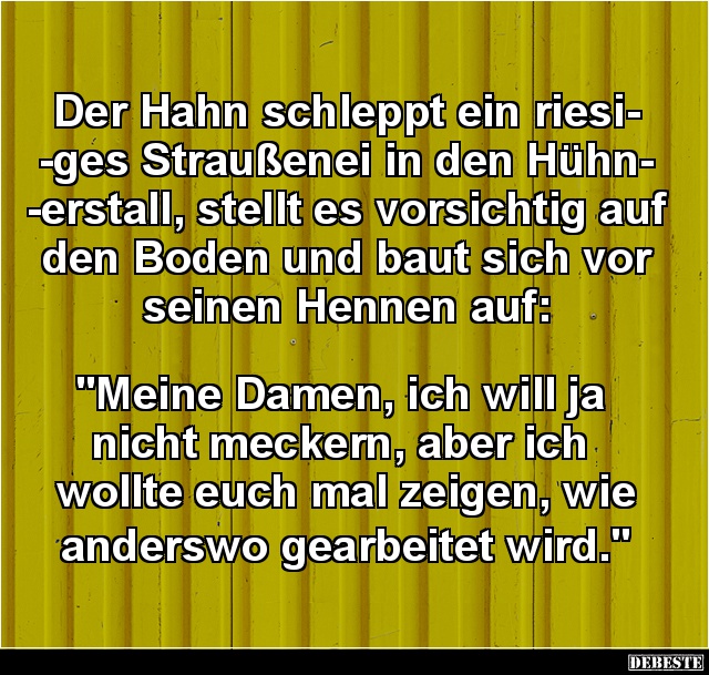 Der Knecht heiratet die Tochter,.. es fallen immer sehr viele Arbeiten auf dem Hof an, er repariert gerade die Scheunentür, als er merkt,daß er das falsche Werkzeug dabei hat, in dem Moment kommt seine Frau vorbei. "Du, hol mir mal Nägel, ruft er ihr zu."