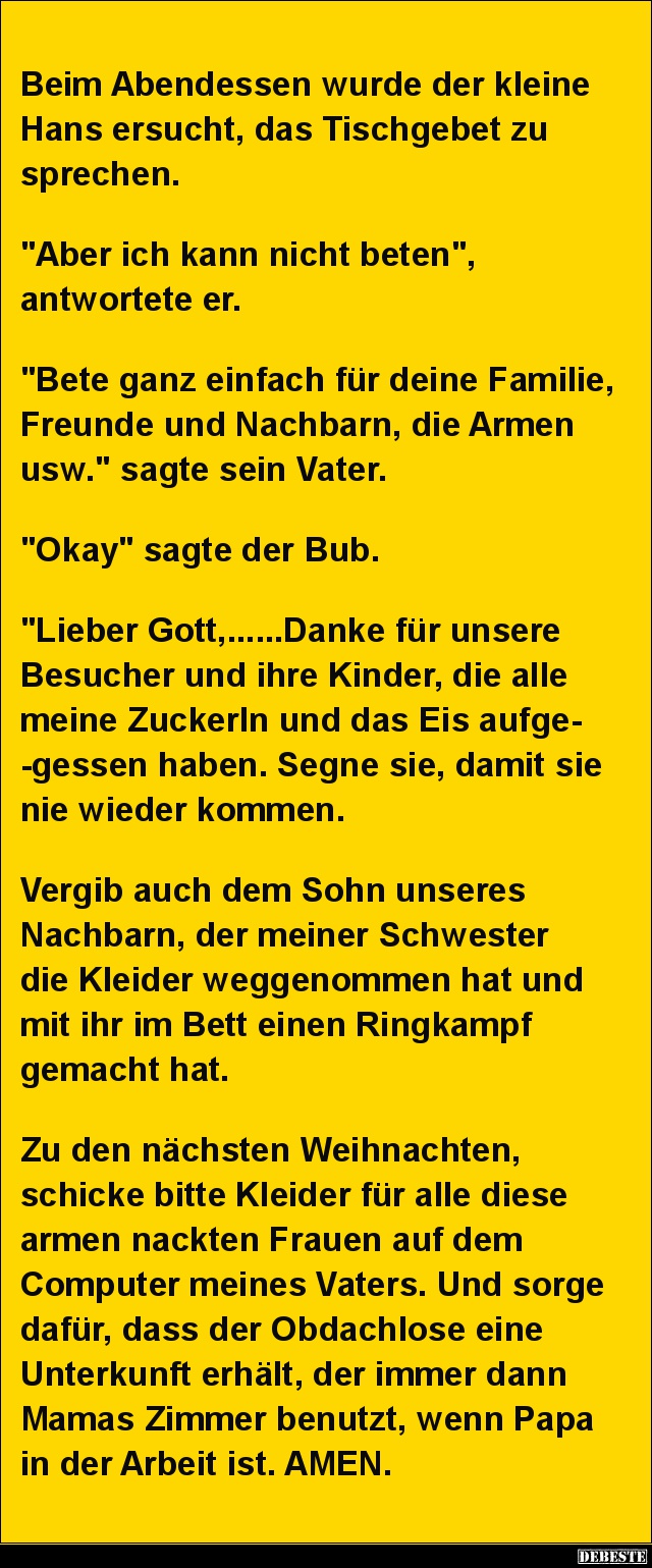 Beim Abendessen wurde der kleine Hans ersucht, das Tischgebet zu