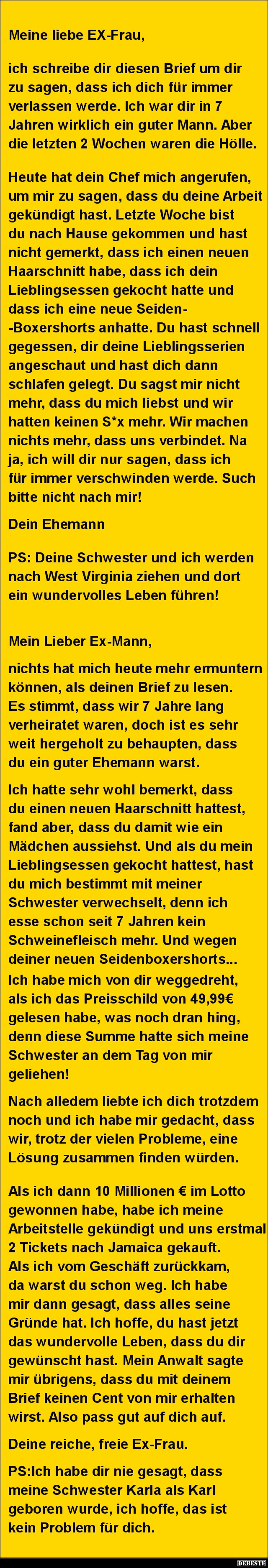 Als ich vom Geschäft zurückkam, da warst du schon weg. Ich habe mir dann gesagt, dass alles seine Gründe hat. Ich hoffe, du hast jetzt das wundervolle Leben, dass du dir gewünscht hast. Mein Anwalt sagte mir übrigens, dass du mit deinem Brief keinen Cent von mir erhalten wirst. Also pass gut auf dich auf.