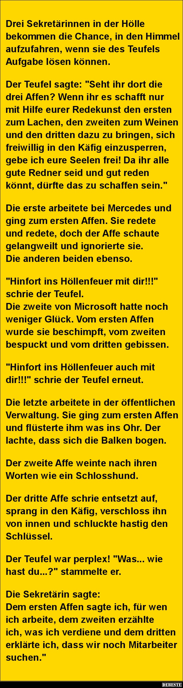 Die letzte arbeitete in der öffentlichen Verwaltung. Sie ging zum ersten Affen und flüsterte ihm was ins Ohr. Der lachte, dass sich die Balken bogen.