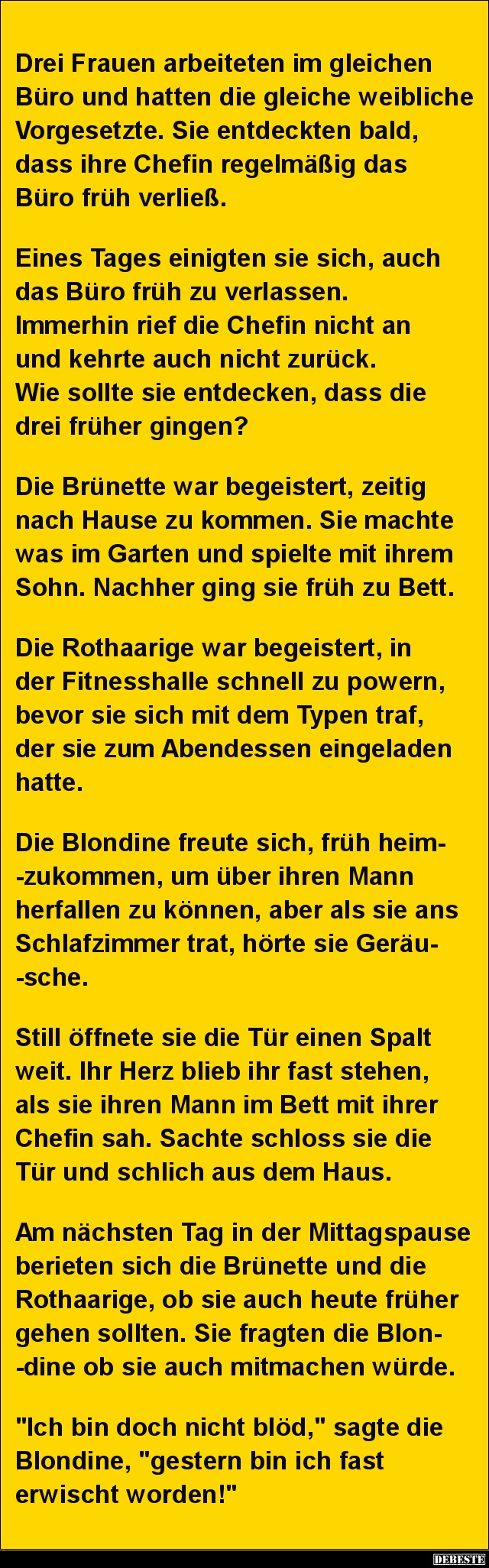 Am nächsten Tag in der Mittagspause berieten sich die Brünette und die Rothaarige, ob sie auch heute früher gehen sollten. Sie fragten die Blon-