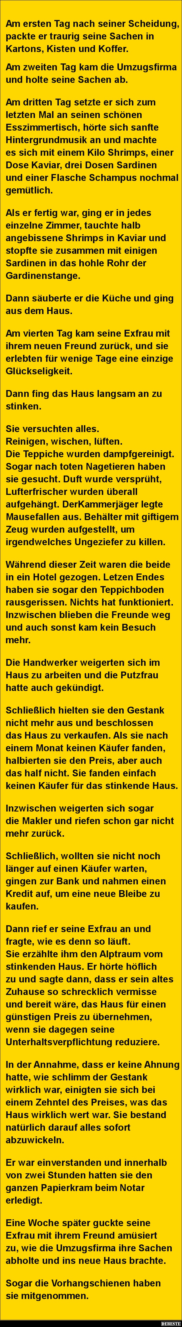 Schließlich hielten sie den Gestank nicht mehr aus und beschlossen das Haus zu verkaufen. Als sie nach einem Monat keinen Käufer fanden, halbierten sie den Preis, aber auch das half nicht. Sie fanden einfach keinen Käufer für das stinkende Haus.