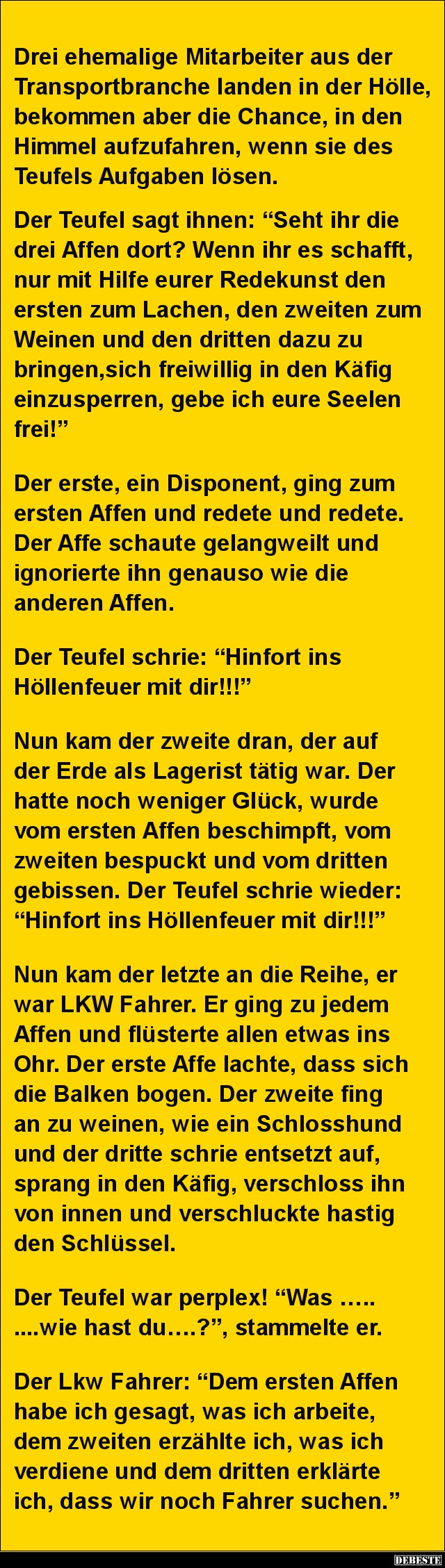 Nun kam der letzte an die Reihe, er war LKW Fahrer. Er ging zu jedem Affen und flüsterte allen etwas ins Ohr. Der erste Affe lachte, dass sich die Balken bogen. Der zweite fing an zu weinen, wie ein Schlosshund und der dritte schrie entsetzt auf, sprang in den Käfig, verschloss ihn von innen und verschluckte hastig den Schlüssel.