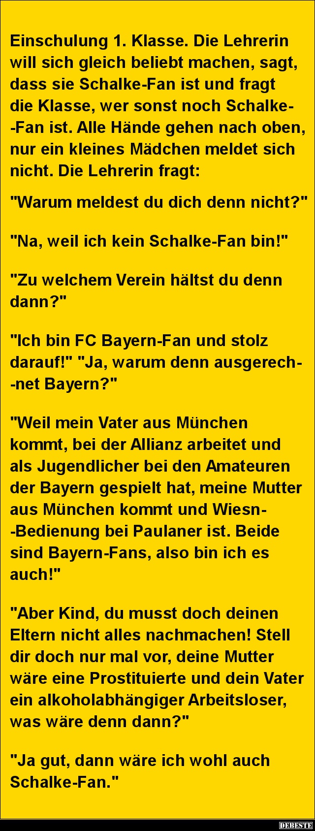 Einschulung 1. Klasse. Die Lehrerin will sich gleich beliebt machen, sagt, dass sie Schalke-Fan ist und fragt die Klasse, wer sonst noch Schalke-
