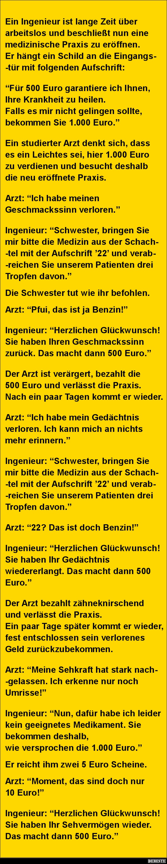 Ingenieur: “Herzlichen Glückwunsch! Sie haben Ihren Geschmackssinn zurück. Das macht dann 500 Euro.”