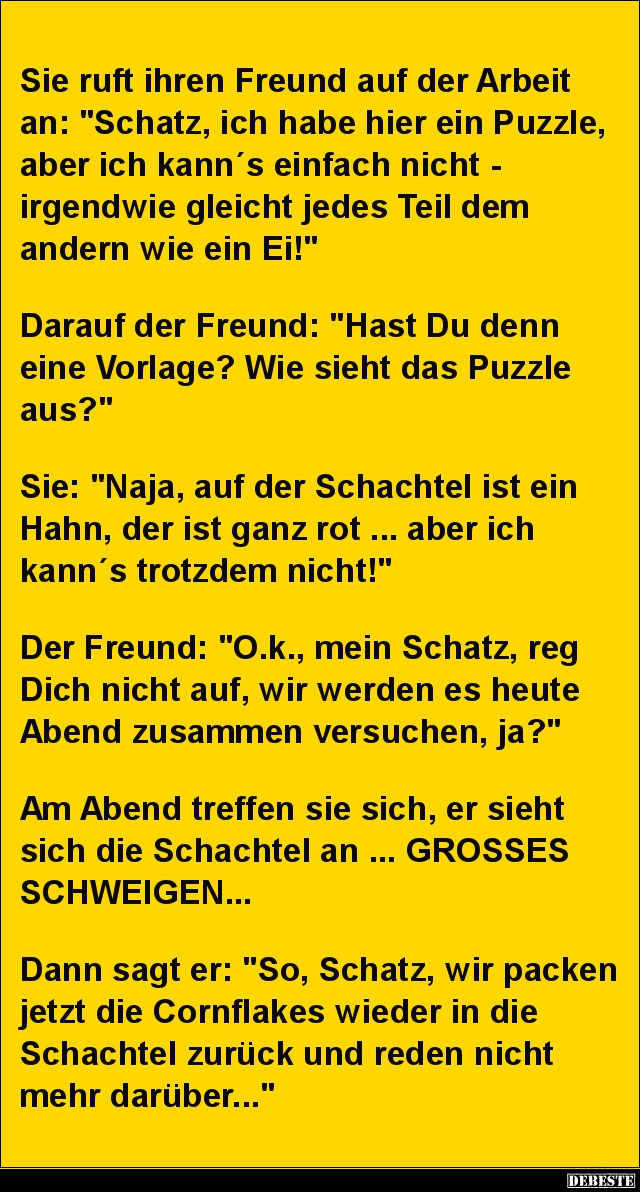 Sie ruft ihren Freund auf der Arbeit an: "Schatz, ich habe hier ein Puzzle, aber ich kann´s einfach nicht -