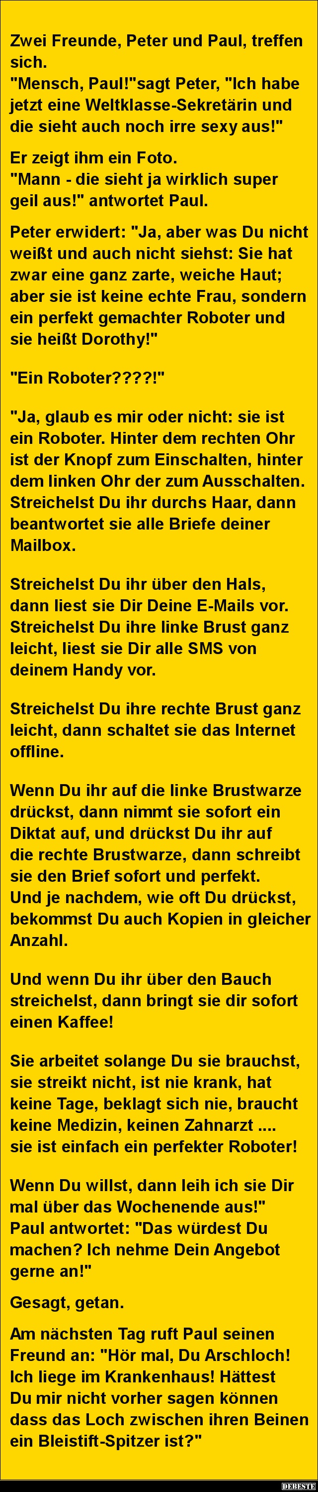 Peter erwidert: "Ja, aber was Du nicht weißt und auch nicht siehst: Sie hat zwar eine ganz zarte, weiche Haut; aber sie ist keine echte Frau, sondern ein perfekt gemachter Roboter und sie heißt Dorothy!"