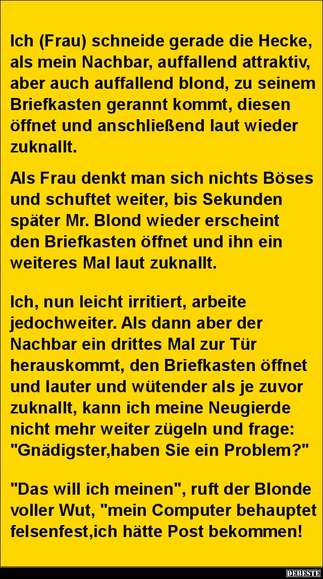 Ich (Frau) schneide gerade die Hecke, als mein Nachbar, auffallend attraktiv, aber auch auffallend blond, zu seinem Briefkasten gerannt kommt, diesen öffnet und anschließend laut wieder zuknallt.