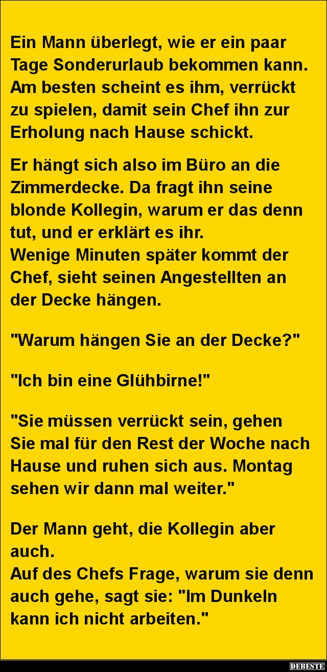 Ein Mann überlegt, wie er ein paar Tage Sonderurlaub bekommen kann.