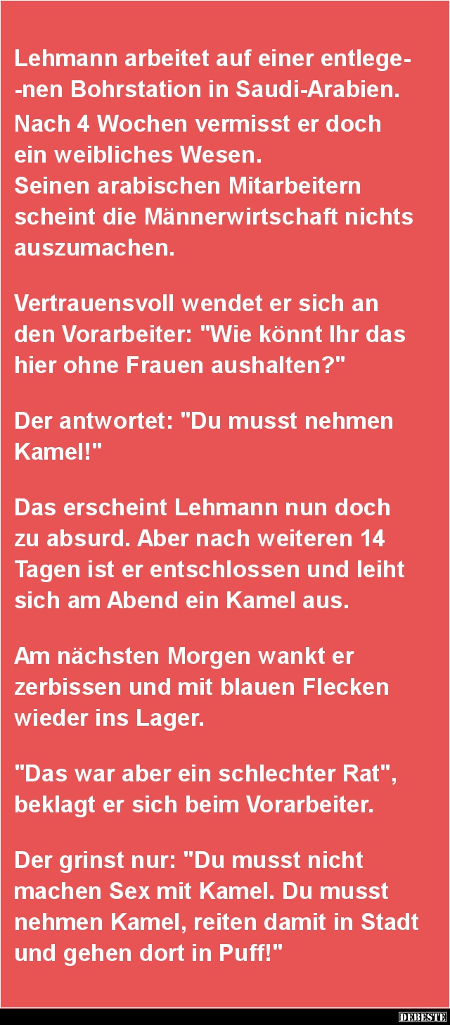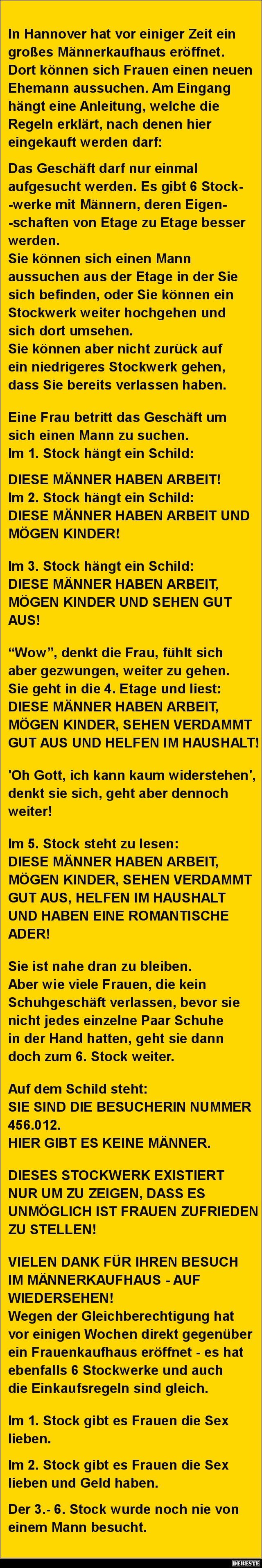 In Hannover hat vor einiger Zeit ein großes Männerkaufhaus eröffnet. Dort können sich Frauen einen neuen Ehemann aussuchen. Am Eingang hängt eine Anleitung, welche die