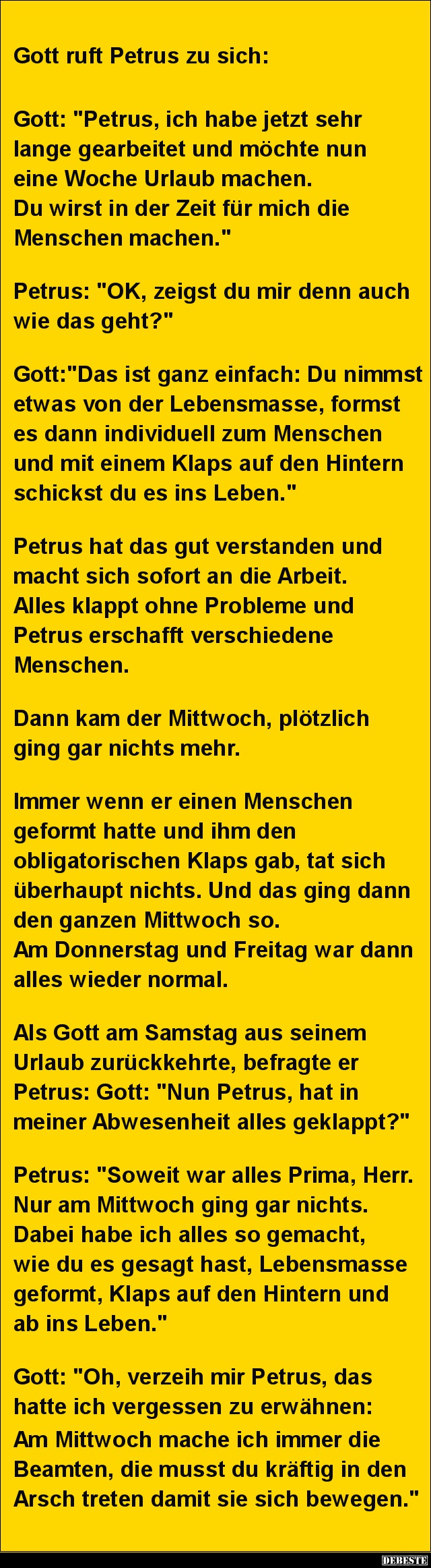 Petrus: "Soweit war alles Prima, Herr. Nur am Mittwoch ging gar nichts. Dabei habe ich alles so gemacht, wie du es gesagt hast, Lebensmasse geformt, Klaps auf den Hintern und ab ins Leben."