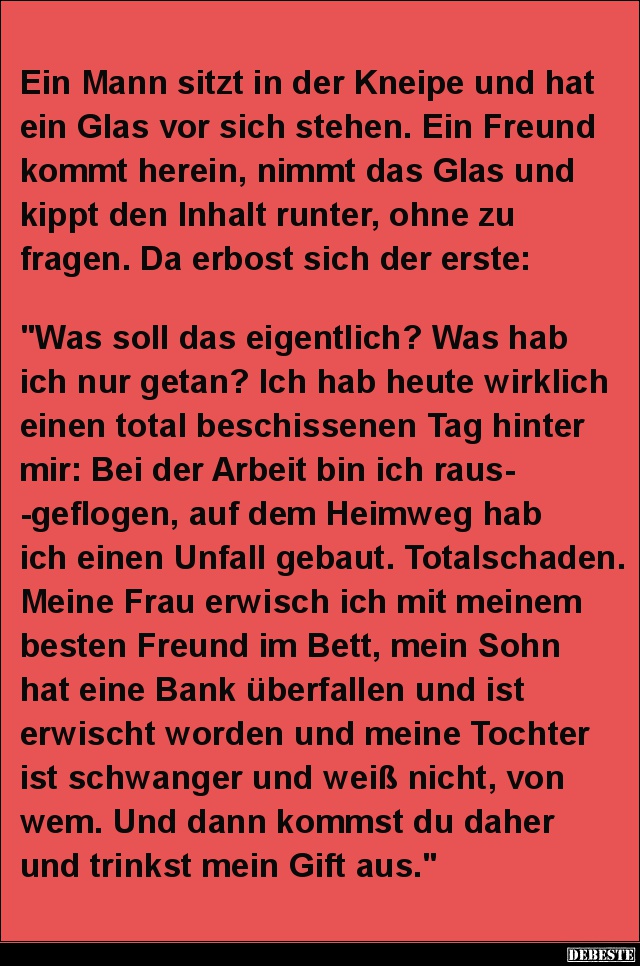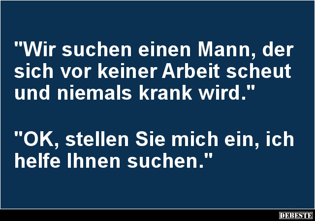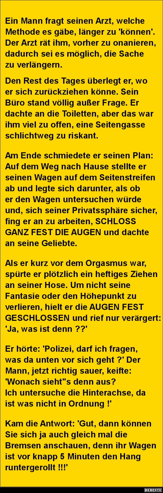 Ein Mann fragt seinen Arzt, welche Methode es gäbe, länger zu 'können'. Der Arzt rät ihm, vorher zu onanieren, dadurch sei es möglich, die Sache zu verlängern.