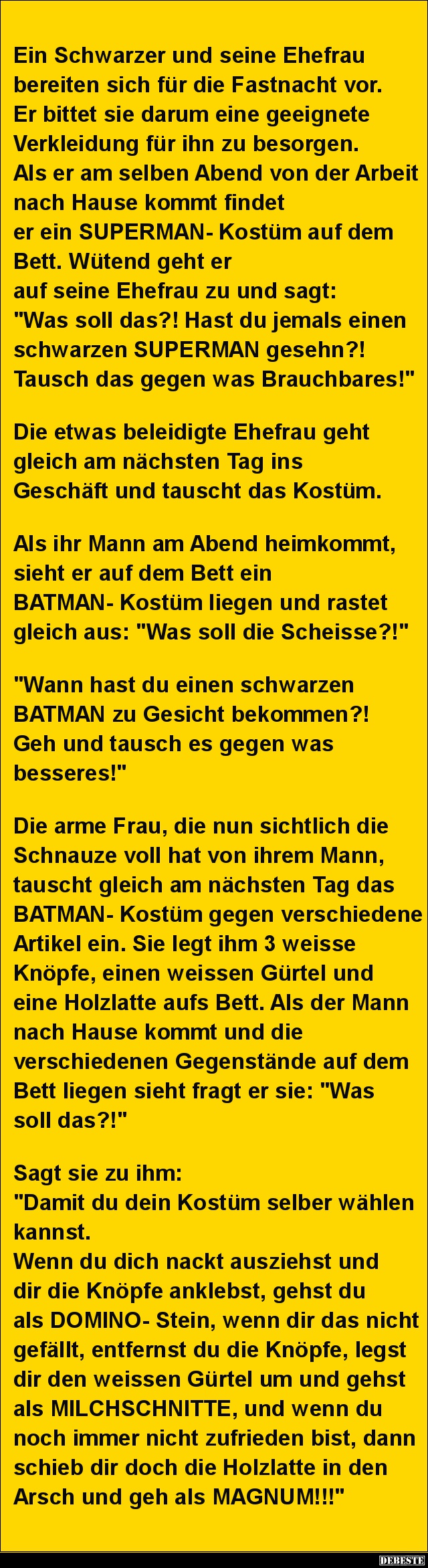 Wenn du dich nackt ausziehst und dir die Knöpfe anklebst, gehst du als DOMINO- Stein, wenn dir das nicht gefällt, entfernst du die Knöpfe, legst dir den weissen Gürtel um und gehst als MILCHSCHNITTE, und wenn du noch immer nicht zufrieden bist, dann schieb dir doch die Holzlatte in den Arsch und geh als MAGNUM!!!"