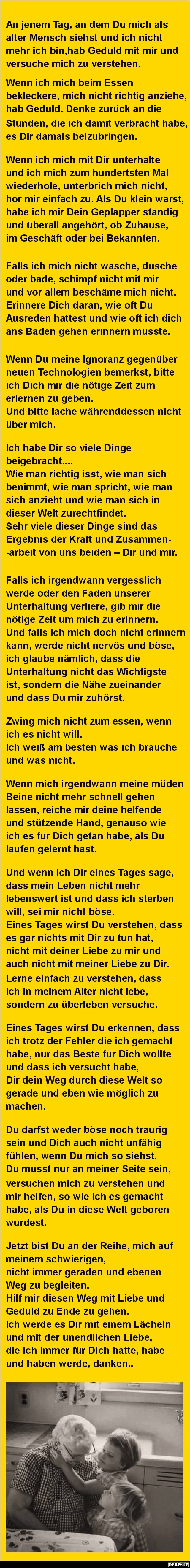 An jenem Tag, an dem Du mich als alter Mensch siehst und ich nicht mehr ich bin,hab Geduld mit mir und versuche mich zu verstehen.