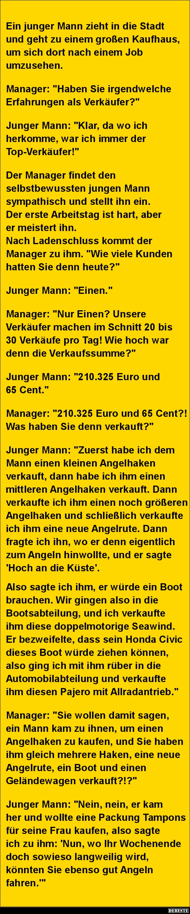 Manager: "Sie wollen damit sagen, ein Mann kam zu ihnen, um einen Angelhaken zu kaufen, und Sie haben ihm gleich mehrere Haken, eine neue Angelrute, ein Boot und einen
