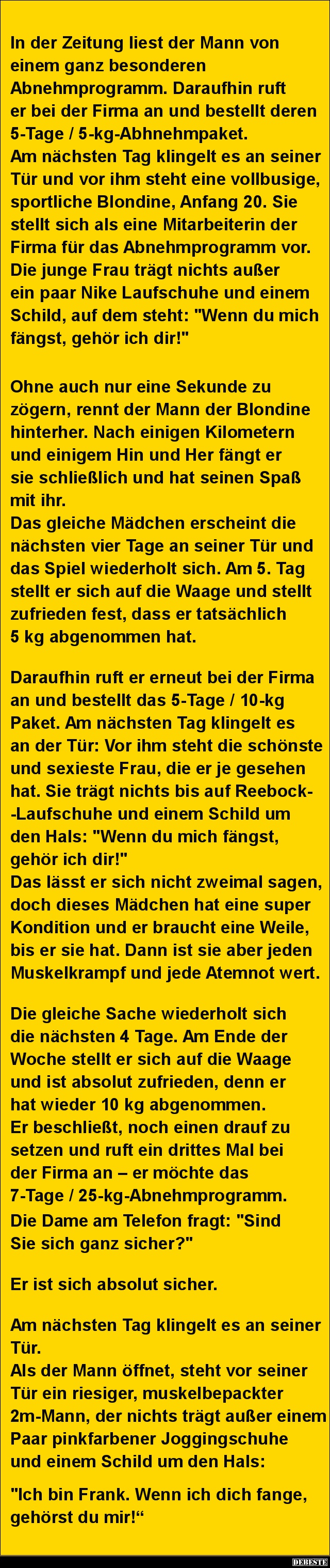 Am nächsten Tag klingelt es an seiner Tür und vor ihm steht eine vollbusige, sportliche Blondine, Anfang 20. Sie stellt sich als eine Mitarbeiterin der Firma für das Abnehmprogramm vor. Die junge Frau trägt nichts außer ein paar Nike Laufschuhe und einem Schild, auf dem steht: "Wenn du mich fängst, gehör ich dir!"