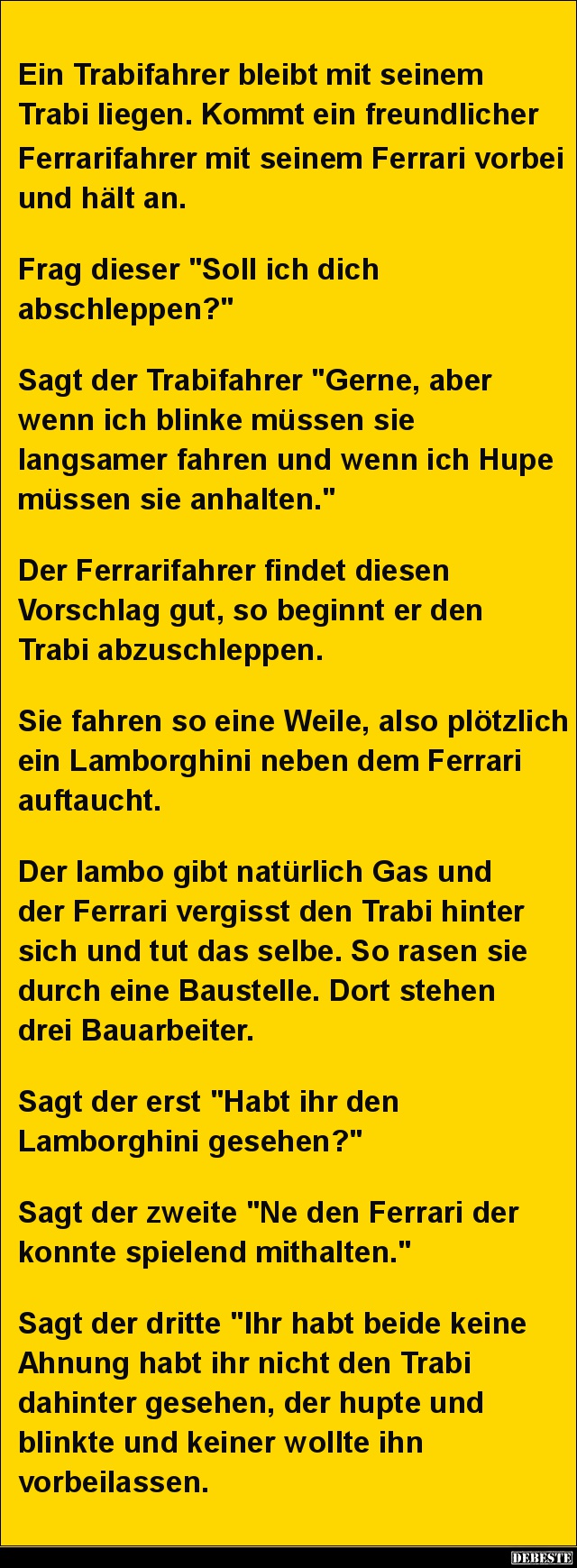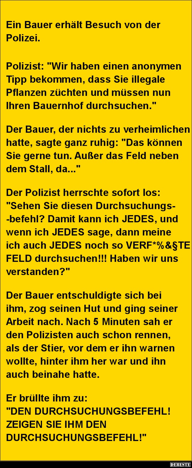 Der Bauer entschuldigte sich bei ihm, zog seinen Hut und ging seiner Arbeit nach. Nach 5 Minuten sah er den Polizisten auch schon rennen, als der Stier, vor dem er ihn warnen wollte, hinter ihm her war und ihn auch beinahe hatte.