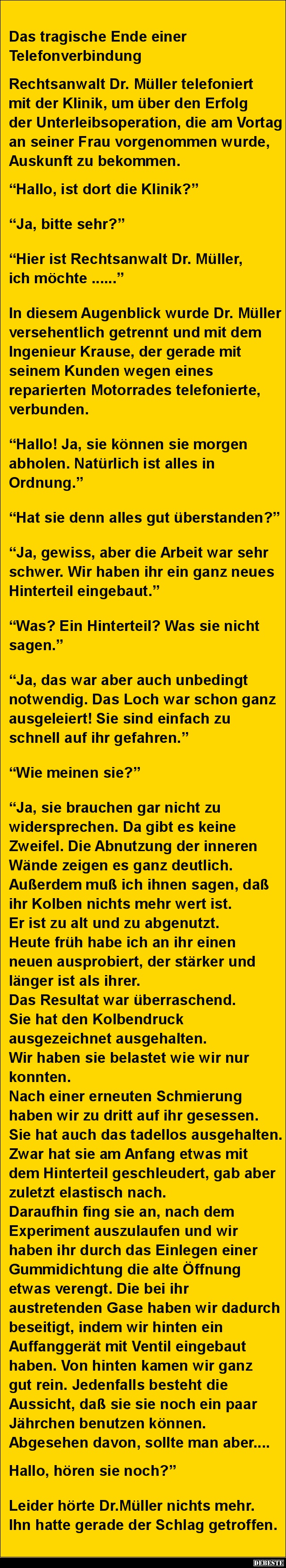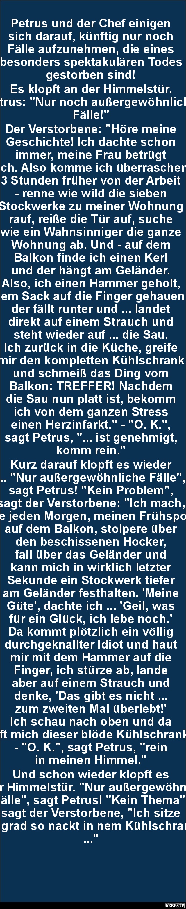Der Verstorbene: "Höre meine Geschichte! Ich dachte schon immer, meine Frau betrügt mich. Also komme ich überraschend 3 Stunden früher von der Arbeit - renne wie wild die sieben Stockwerke zu meiner Wohnung rauf, reiße die Tür auf, suche wie ein Wahnsinniger die ganze Wohnung ab. Und - auf dem Balkon finde ich einen Kerl und der hängt am Geländer. Also, ich einen Hammer geholt, dem Sack auf die Finger gehauen, der fällt runter und ... landet direkt auf einem Strauch und steht wieder auf ... die Sau. Ich zurück in die Küche, greife mir den kompletten Kühlschrank und schmeiß das Ding vom Balkon: TREFFER! Nachdem die Sau nun platt ist, bekomm ich von dem ganzen Stress einen Herzinfarkt." - "O. K.", sagt Petrus, "... ist genehmigt, komm rein."
