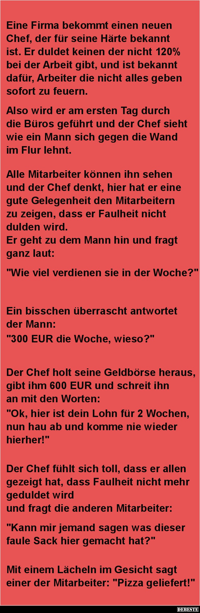 Der Chef holt seine Geldbörse heraus, gibt ihm 600 EUR und schreit ihn an mit den Worten: