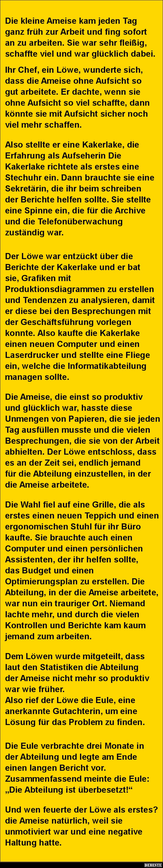 Ihr Chef, ein Löwe, wunderte sich, dass die Ameise ohne Aufsicht so gut arbeitete. Er dachte, wenn sie ohne Aufsicht so viel schaffte, dann könnte sie mit Aufsicht sicher noch viel mehr schaffen.