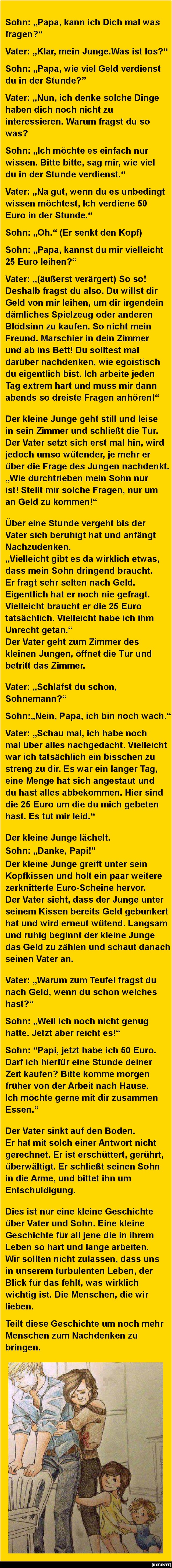Vater: „Na gut, wenn du es unbedingt wissen möchtest, Ich verdiene 50 Euro in der Stunde.“