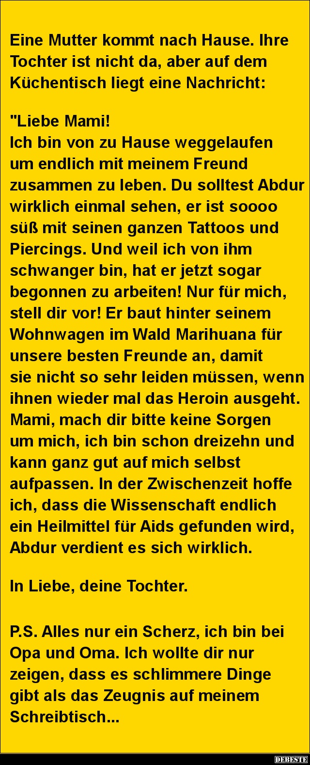 Eine Mutter kommt nach Hause. Ihre Tochter ist nicht da, aber auf dem Küchentisch liegt eine Nachricht: