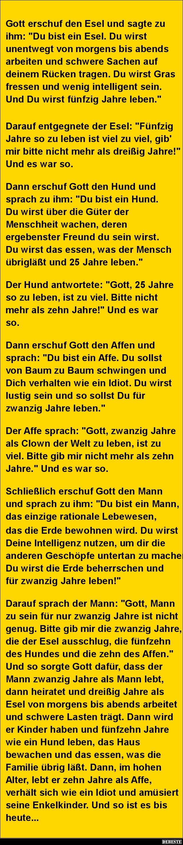 Darauf sprach der Mann: "Gott, Mann zu sein für nur zwanzig Jahre ist nicht genug. Bitte gib mir die zwanzig Jahre, die der Esel ausschlug, die fünfzehn des Hundes und die zehn des Affen." Und so sorgte Gott dafür, dass der Mann zwanzig Jahre als Mann lebt, dann heiratet und dreißig Jahre als Esel von morgens bis abends arbeitet und schwere Lasten trägt. Dann wird er Kinder haben und fünfzehn Jahre wie ein Hund leben, das Haus