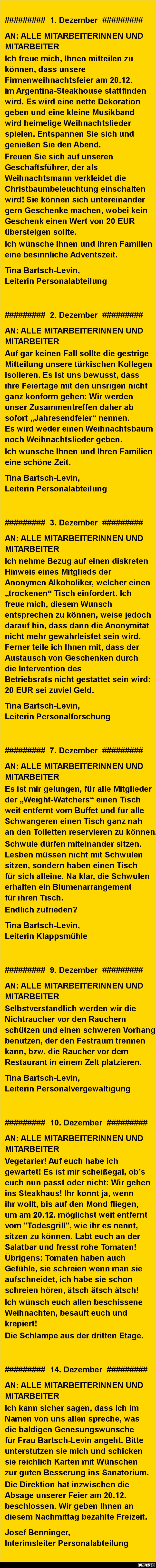 Firmenweihnachtsfeier am 20.12. im Argentina-Steakhouse stattfinden wird. Es wird eine nette Dekoration geben und eine kleine Musikband wird heimelige Weihnachtslieder