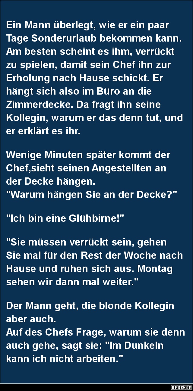 Ein Mann überlegt, wie er ein paar Tage Sonderurlaub bekommen kann. Am besten scheint es ihm, verrückt zu spielen, damit sein Chef ihn zur Erholung nach Hause schickt. Er hängt sich also im Büro an die