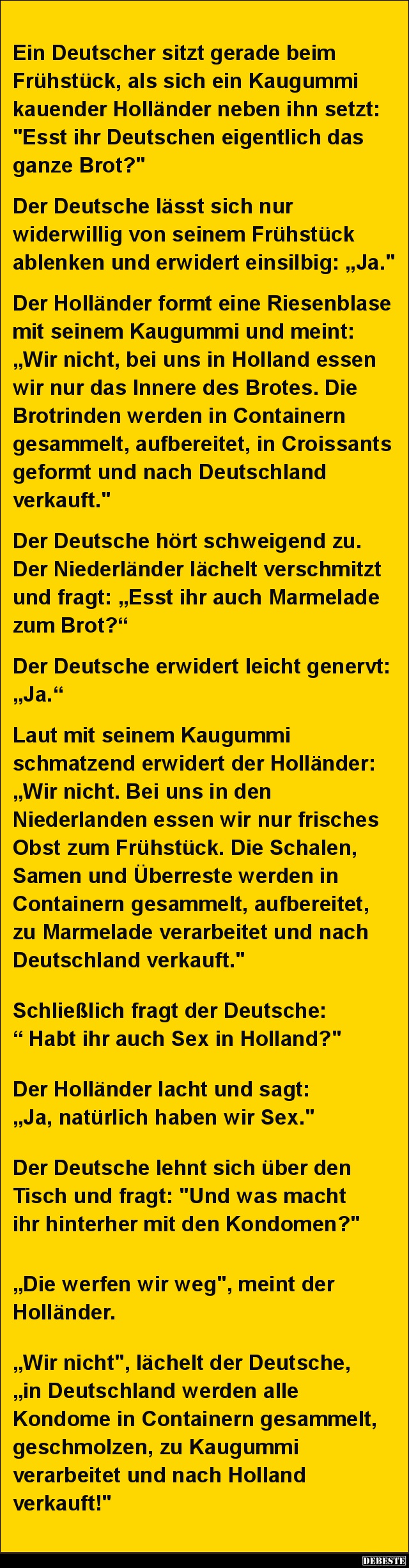 Der Deutsche hört schweigend zu. Der Niederländer lächelt verschmitzt und fragt: „Esst ihr auch Marmelade zum Brot?“