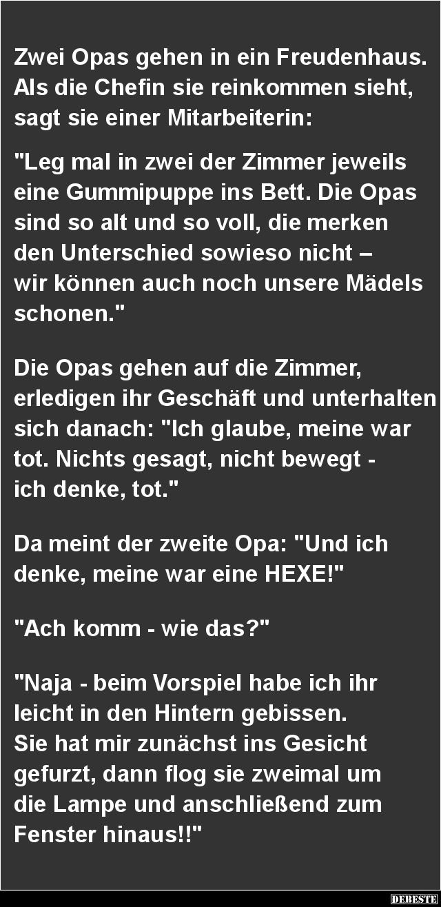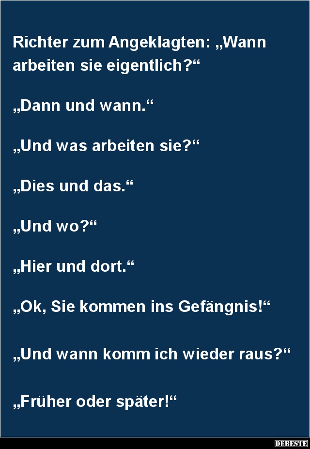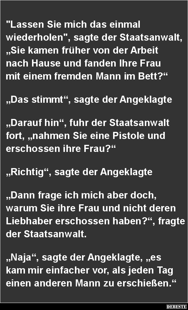 „Naja“, sagte der Angeklagte, „es kam mir einfacher vor, als jeden Tag einen anderen Mann zu erschießen.“