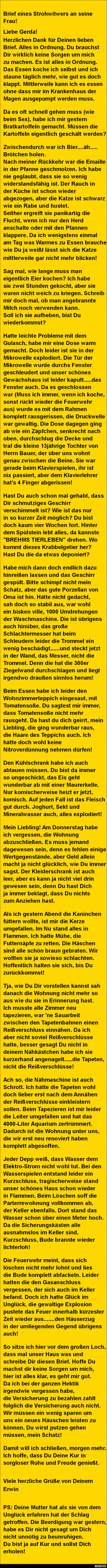 Herzlichen Dank für Deinen lieben Brief. Alles in Ordnung. Du brauchst Dir wirklich keine Sorgen um mich zu machen. Es ist alles in Ordnung. Das Essen koche ich selbst und ich staune täglich mehr, wie gut es doch klappt. Mittlerweile kann ich es essen ohne dass mir im Krankenhaus der Magen ausgepumpt werden muss.
