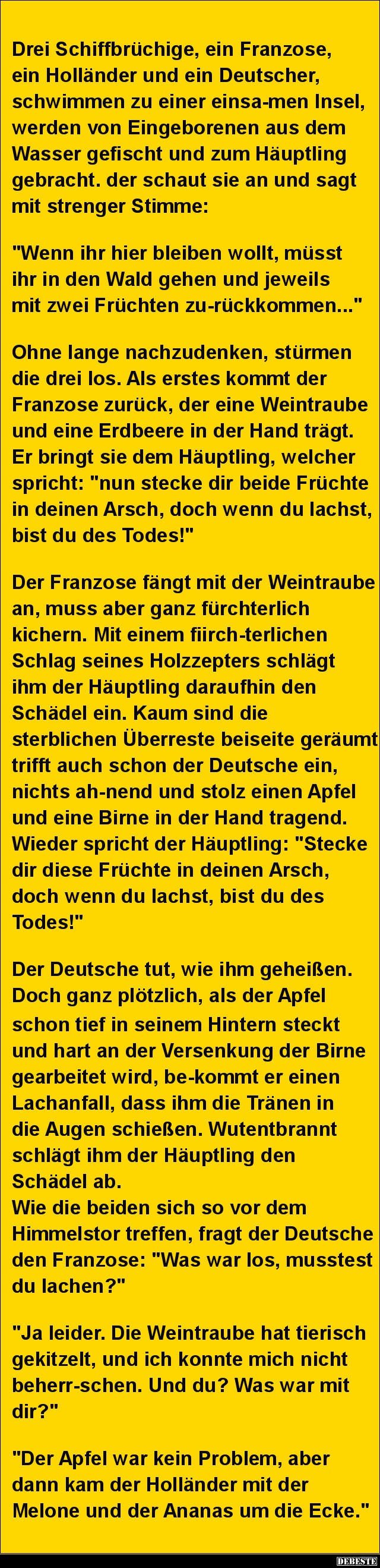 Drei Schiffbrüchige, ein Franzose, ein Holländer und ein Deutscher, schwimmen zu einer einsa-men Insel, werden von Eingeborenen aus dem Wasser gefischt und zum Häuptling gebracht. der schaut sie an und sagt mit strenger Stimme: