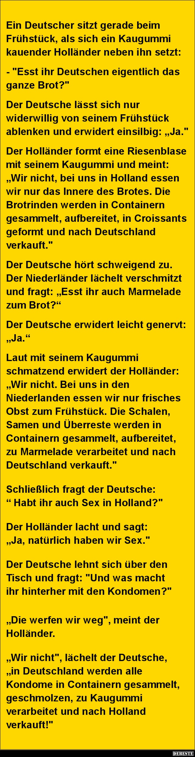 Frühstück, als sich ein Kaugummi kauender Holländer neben ihn setzt: "Esst ihr Deutschen eigentlich das ganze Brot?"