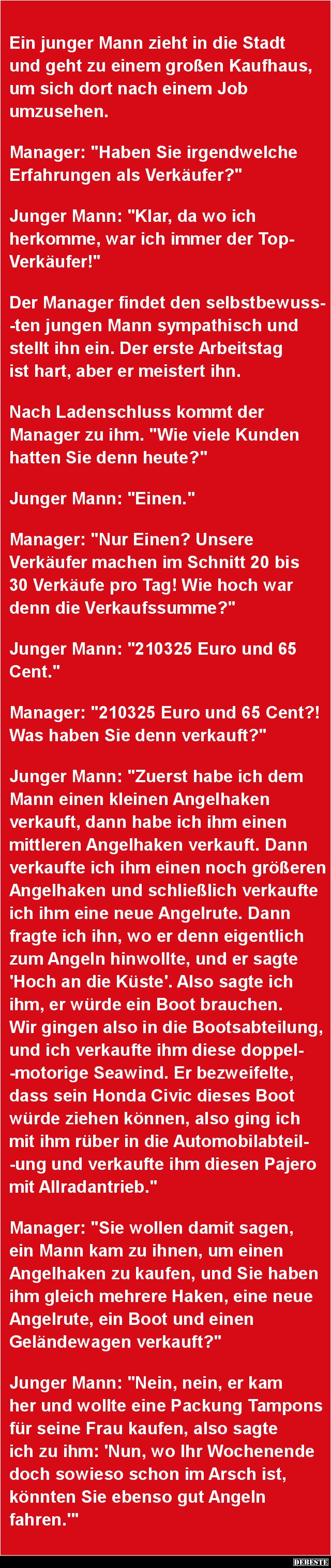 Manager: "Sie wollen damit sagen, ein Mann kam zu ihnen, um einen Angelhaken zu kaufen, und Sie haben ihm gleich mehrere Haken, eine neue Angelrute, ein Boot und einen